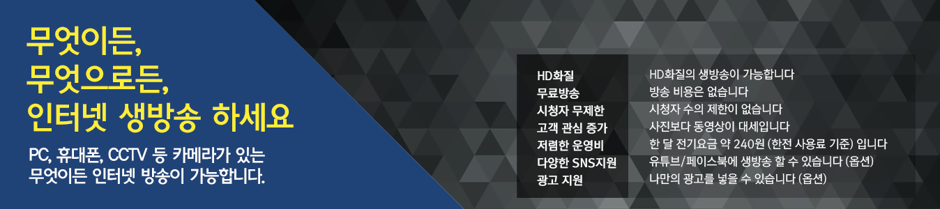 스마트폰 앱 마켓(구글 플레이어, 앱스토어 등)에서 무료로 배포되는 RTMP 방송 앱을 설치하시고, 앱 설정 화면에서 본인의 RTMP주소(별도 주소 제공)를 등록하고 방송 버튼을 누르면 끝입니다.