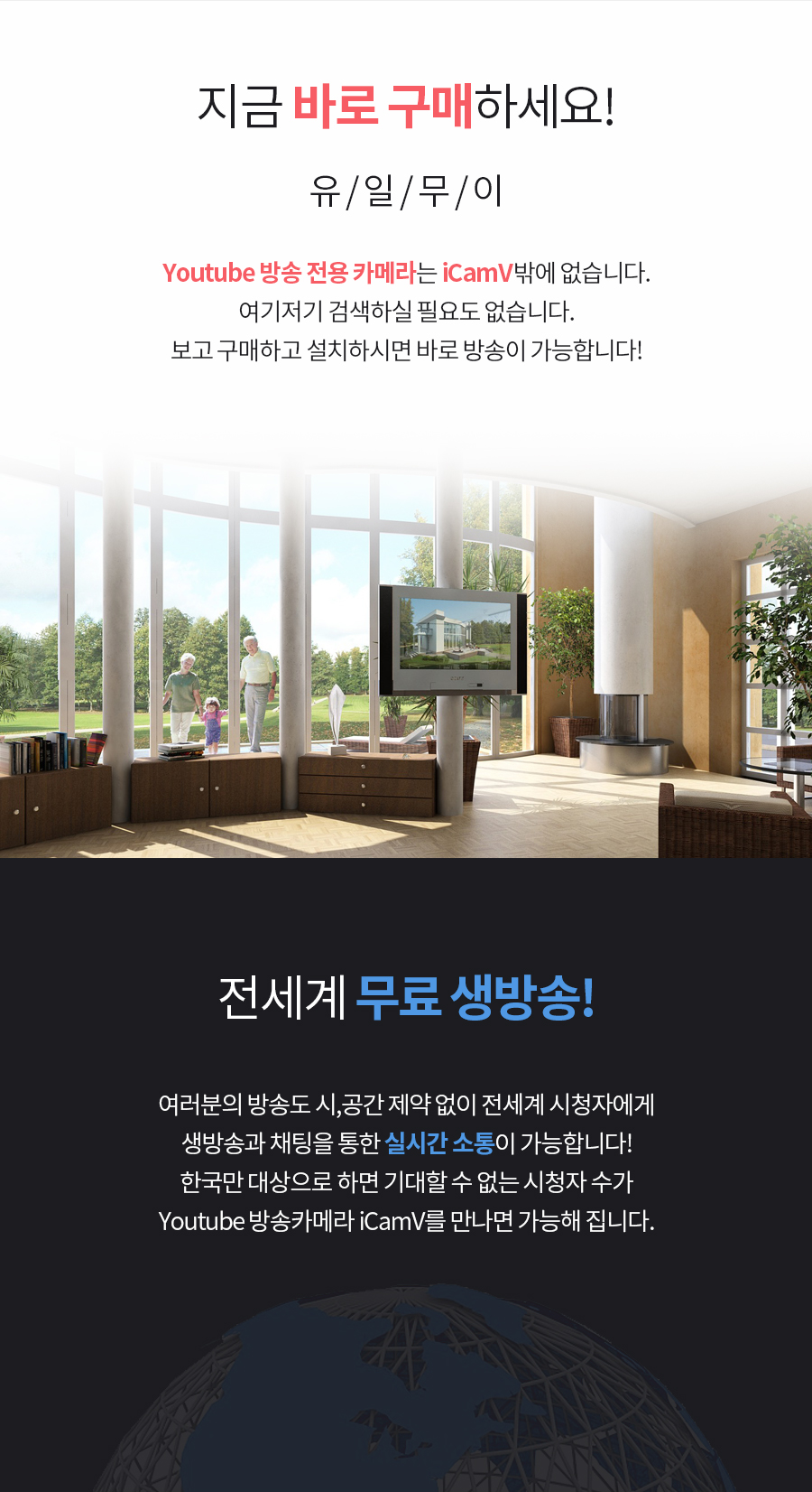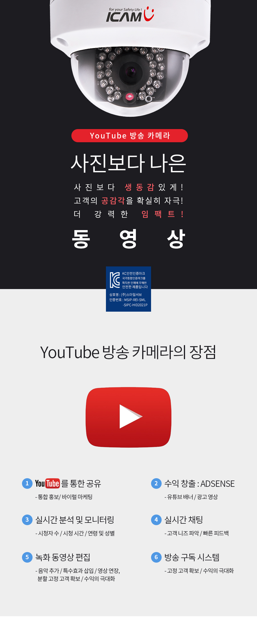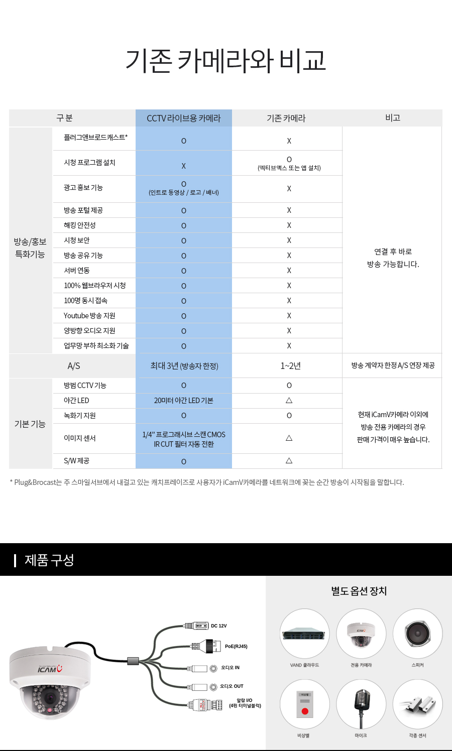 | PC | 휴대폰 | DSLR/방송 카메라 | 기존 CCTV | iCamV 카메라 | |