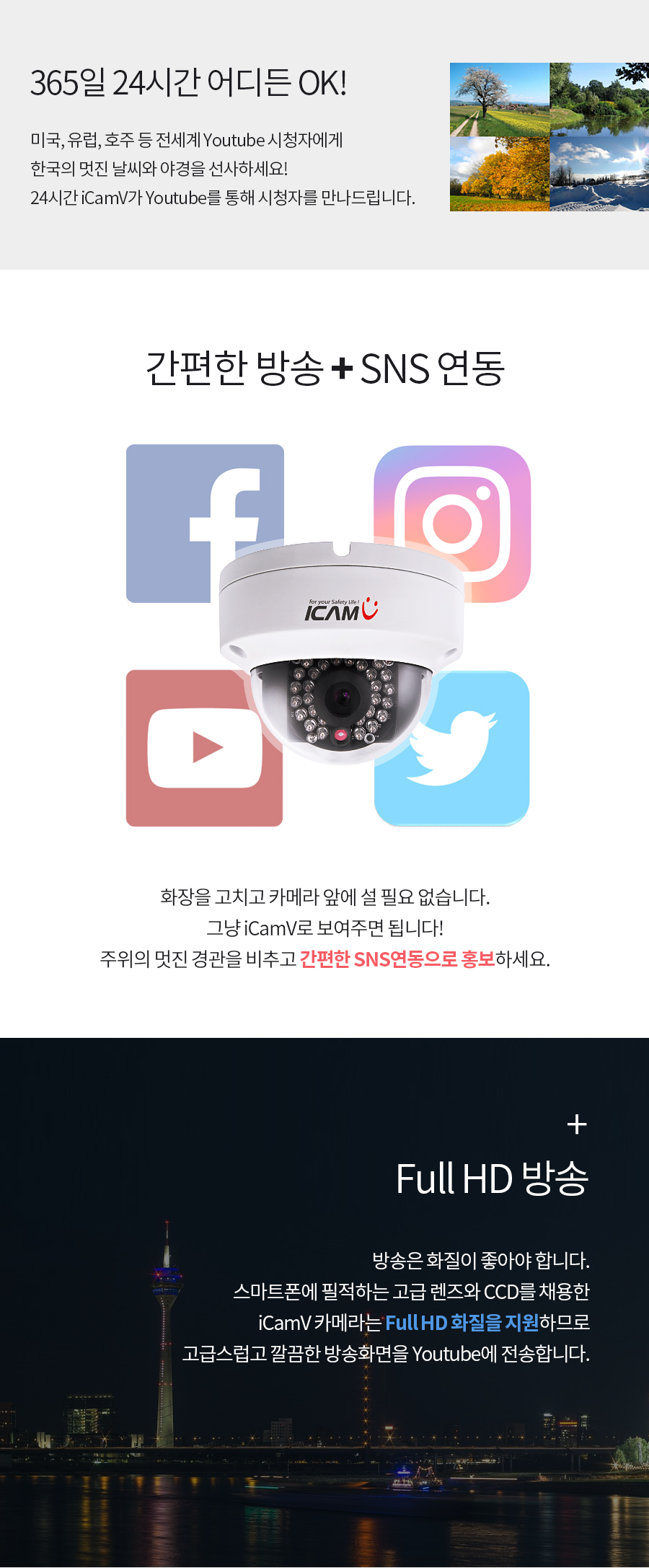 4계절, 24시간은 스마트폰, 방송카메라등으론 분가능하죠? CCTV라이브 전용장비라면, 실/내외를 망론하고 설치된 장소의 모든 것을 24시간 방송을 할 수 있습니다. 눈/비/바람 등을 버틸 수 있는 방송 카메라로 CCTV라이브 전용 카메라를 사용하시면 가능합니다.