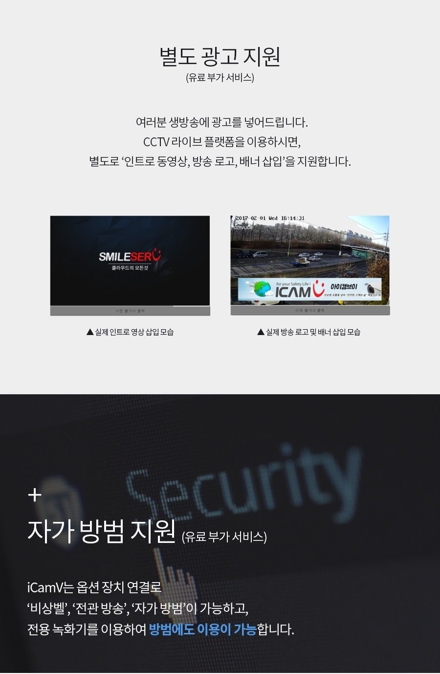 지금까지 대부분 방송장비는 방송자가 지키고 있어야 했습니다. CCTV를 사용하면 지키고 있을 필요도 없죠. 고속도로 상황을 보여주는 CCTV처럼, 기존 CCTV카메라를 방송용으로 활용하시면 추가 구매 없이도 언제든 방송을 할 수 있습니다. 물론, 사생활 보호가 필요한 곳을 방송하는 것은 법으로 엄격히 금지하고 CCTV라이브도 이를 용인하지 않습니다. 지금 CCTV카메라의 방향을 외부로 비춰보세요. 아름다운 주변 경관을 방송 가능합니다.